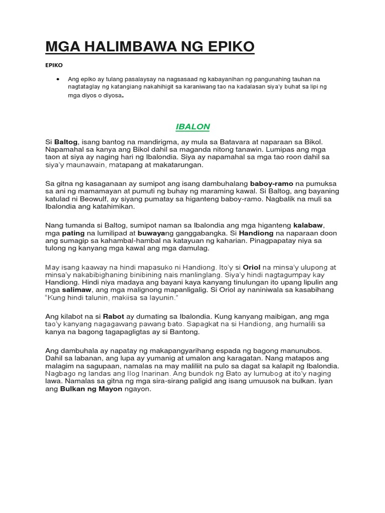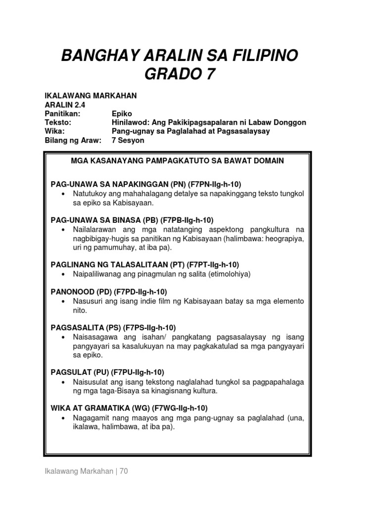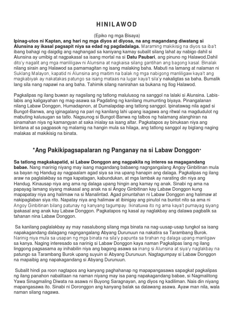 Isa sa mga halimbawa ng epiko ng Pilipinas ang Labaw Donggon na epikong Bisaya. O Scribd é o maior site social de leitura e publicação do mundo.