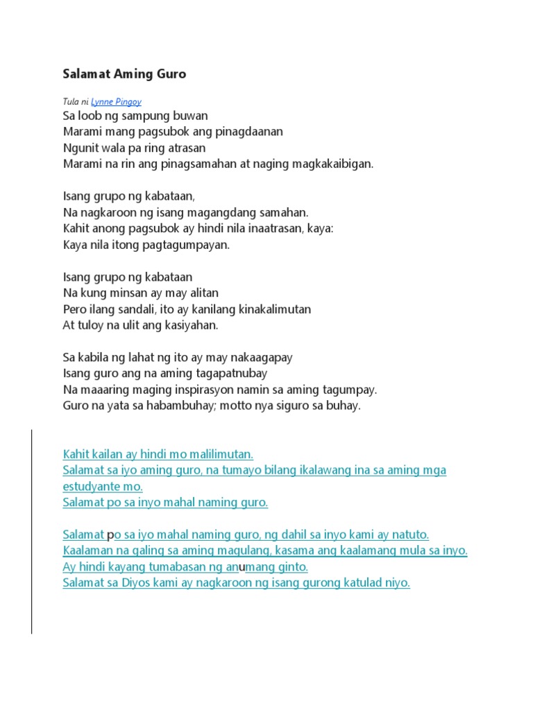 Maraming salamat guro sa iyong mga itinuro. Salamat sa inyo aking mga guro Sapagkat kung wala kayo di kami natuto Lahat ng alam namin utang namin sa inyo. Sa aking mga naging guro at guro sa ngayon alam ko ang hirap at sakripisyo na nakadikit sa inyong propesyon.
